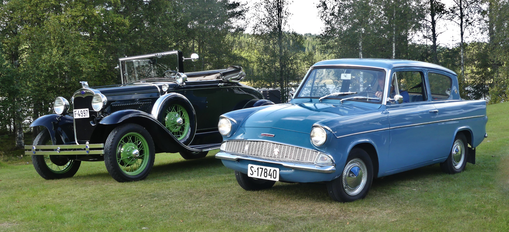 Fra Motorveteranene Hedmarks treff på Rasen Leirsted i august. To flotte Forder, bygd på hvert sitt kontinent, og med 34 års aldersforskjell (1930/1964).