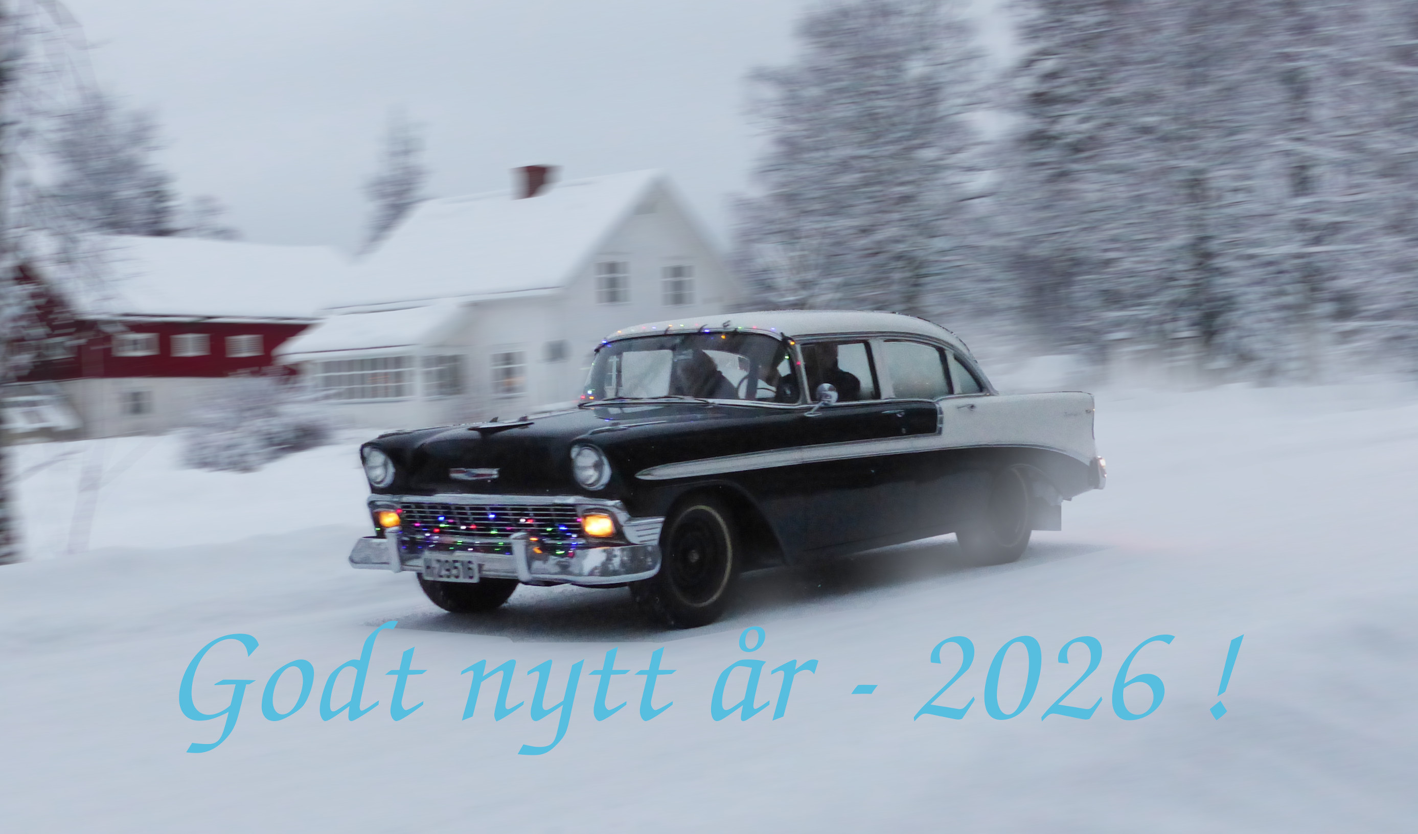 Med dette bildet, tatt under et tidligere års nyttårsløp, ønsker vi alle våre medlemmer et riktig godt nytt år! Her er det Hellen og Magnar som er ute og kjører i deres '56 Chevrolet, en bil som dermed feirer 70-årsjubileum i det nye året, slett ingen dårlig prestasjon for en gammel sliter!